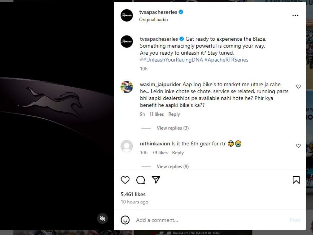 ‘Blazing Soon’ என்ற பெயரில் வெளியிடப்பட்டுள்ள டீசரில் அப்பாச்சி ஆர்டிஆர் பைக்கினை விற்பனைக்கு உறுதி செய்யும் வகையில் டிவிஎஸ் மோட்டார் டீசர் வெளியாகியுள்ளது. ஆனால் அப்பாச்சி பிரிவில் உள்ள RTR 160, RTR 180, RTR 200, RTR 310 போன்றவை விற்பனையில் உள்ள நிலையில் ஃபேரிங் ஸ்டைல் பெற்ற RR310 R ஆகியவை கிடைக்கின்றது.
