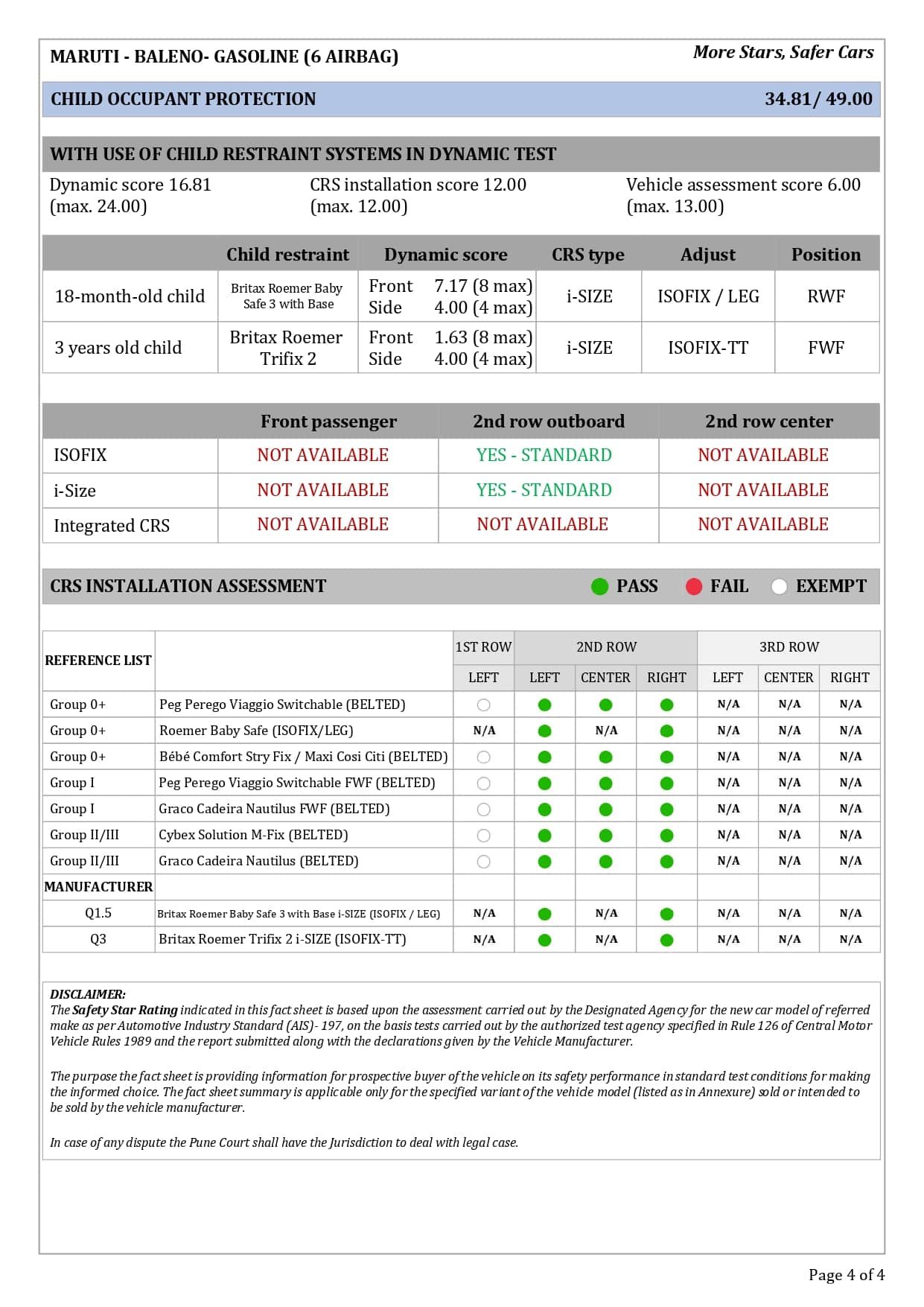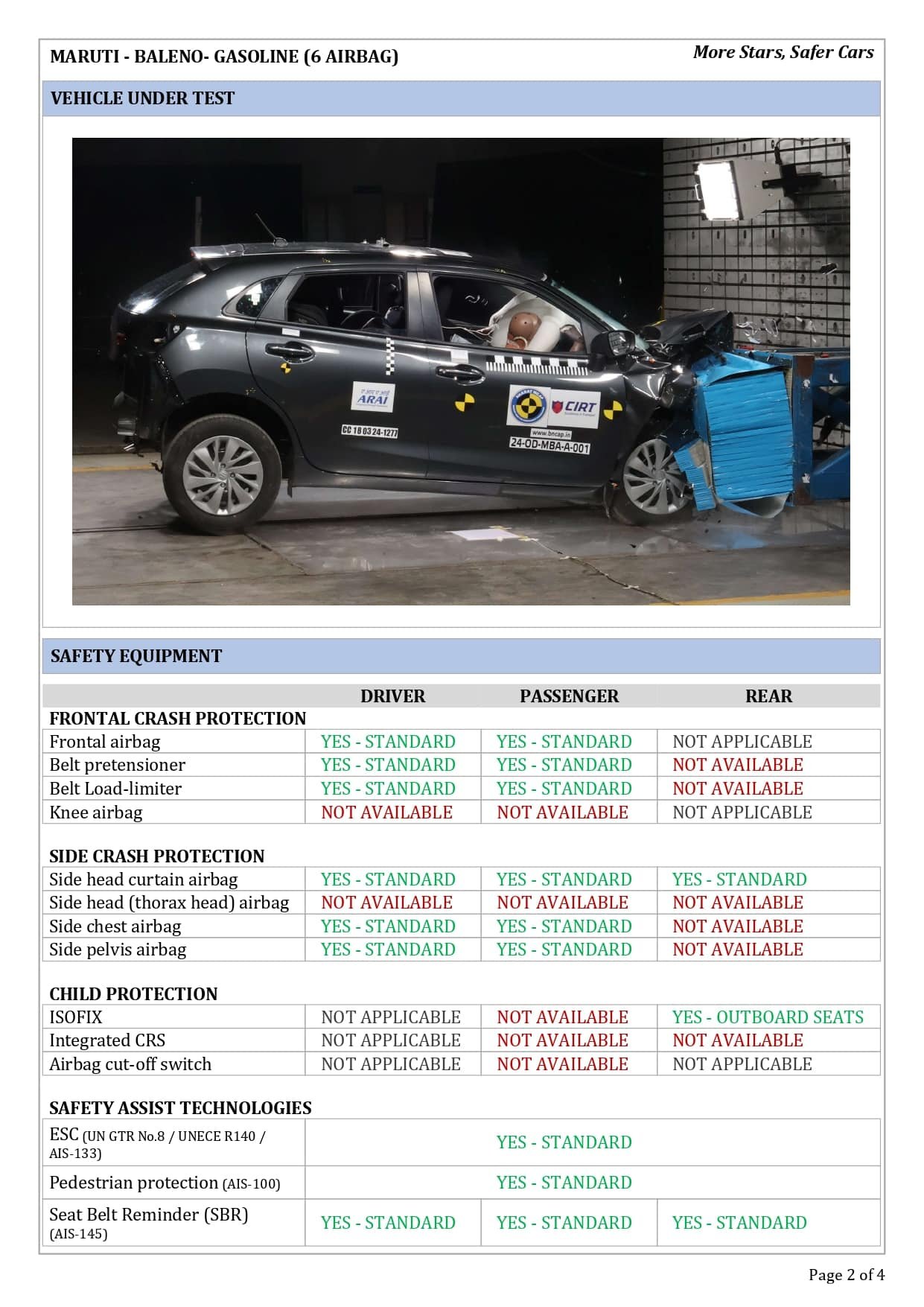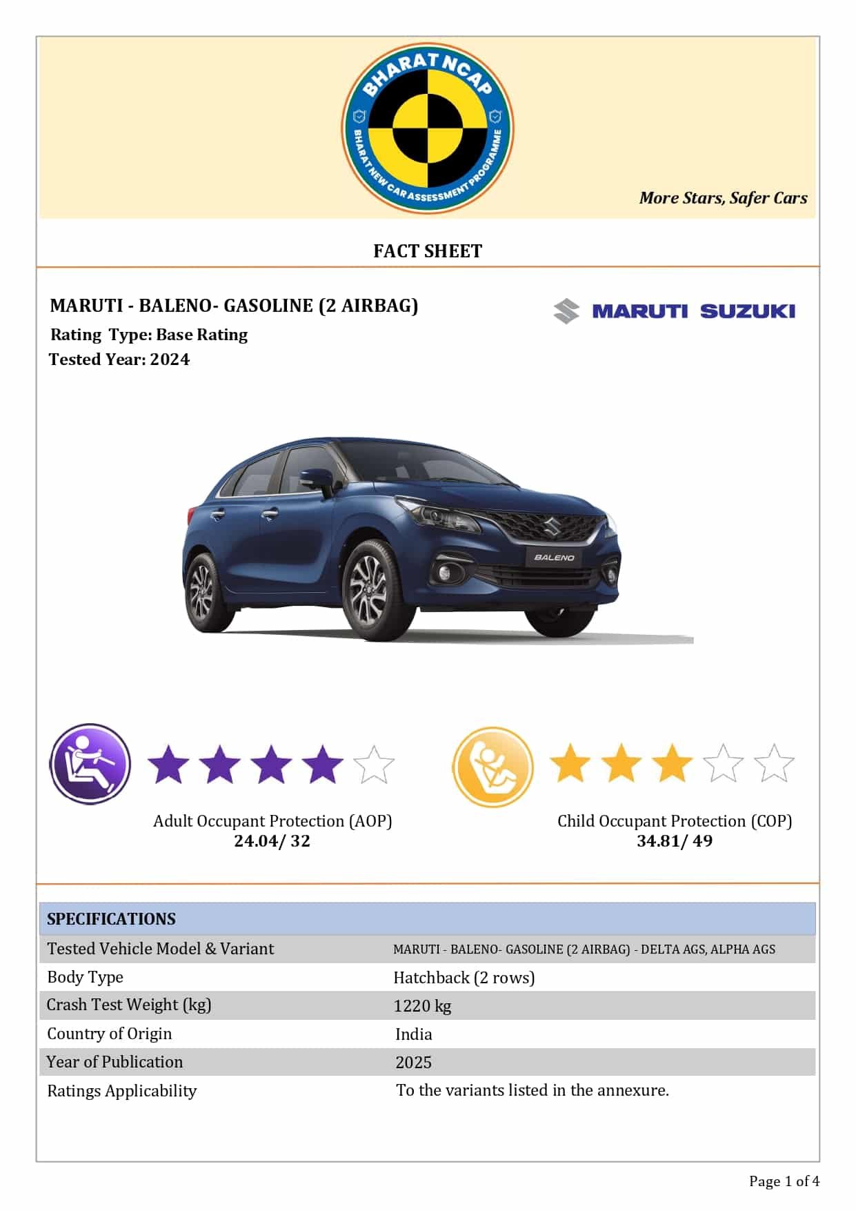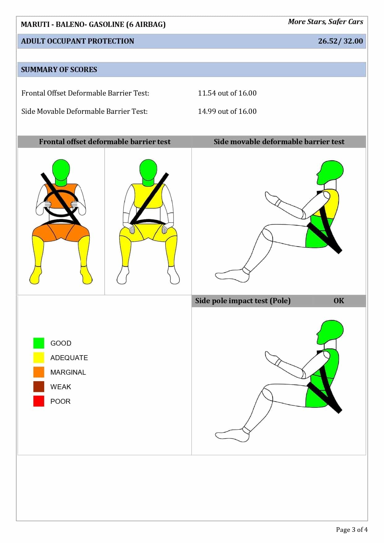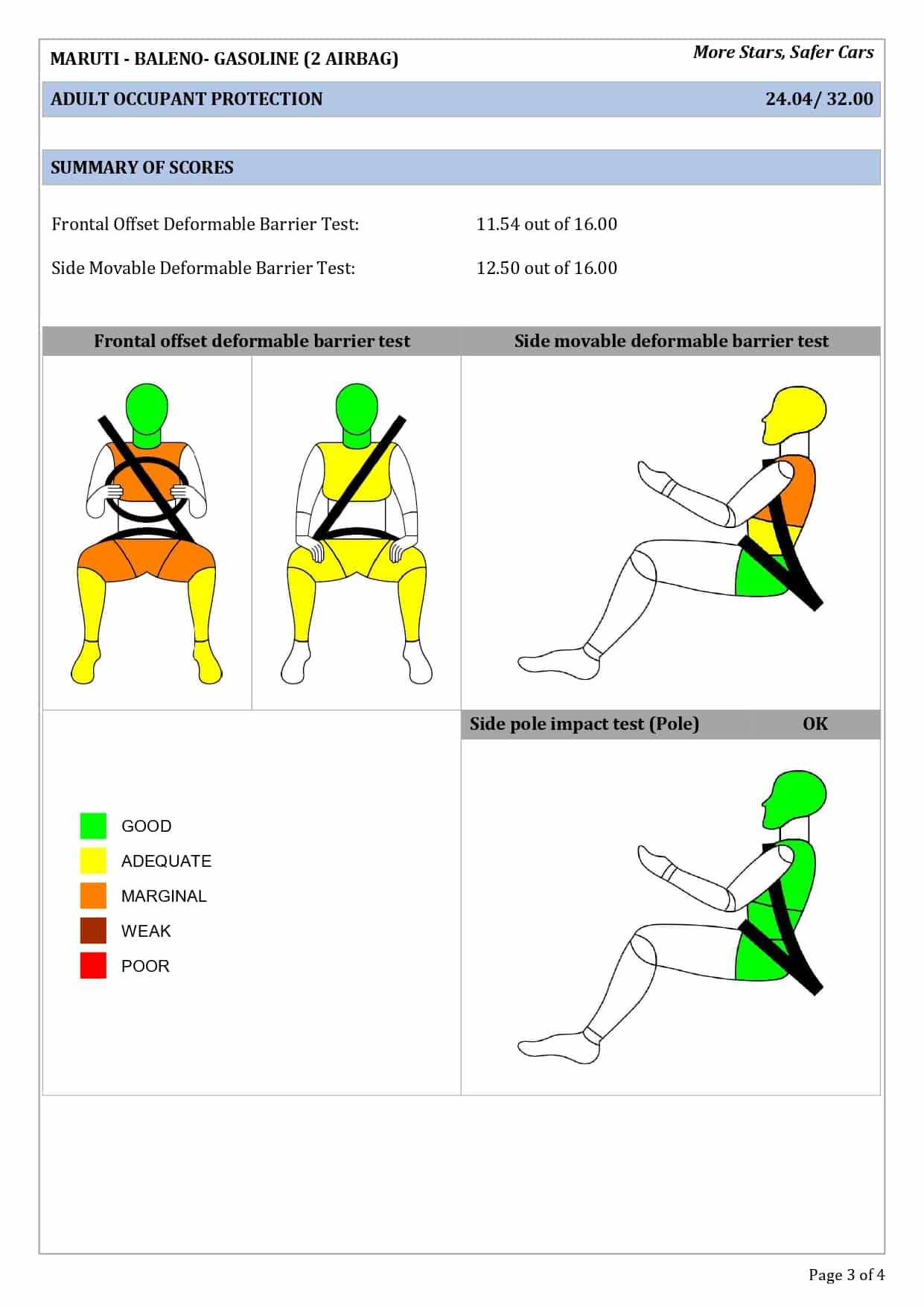 இந்தியாவில் அதிக விற்பனையாகின்ற பிரபலமான மாருதி சுசூகி நிறுவனத்தின் பலேனோ காரின் 2 ஏர்பேக்குகள் மற்றும் 6 ஏர்பேக்குகள் உள்ள மாடல்கள் தற்பொழுது பாரத் கிராஸ் டெஸ்ட் மூலம் சோதனை செய்யப்பட்டு நான்கு ஸ்டார் ரேட்டிங் மதிப்பை வயது வந்தோர் பாதுகாப்பிலும், 3 ஸ்டார் ரேட்டிங்கை குழந்தைகளுக்கான பாதுகாப்பில் பெற்றிருக்கின்றது.