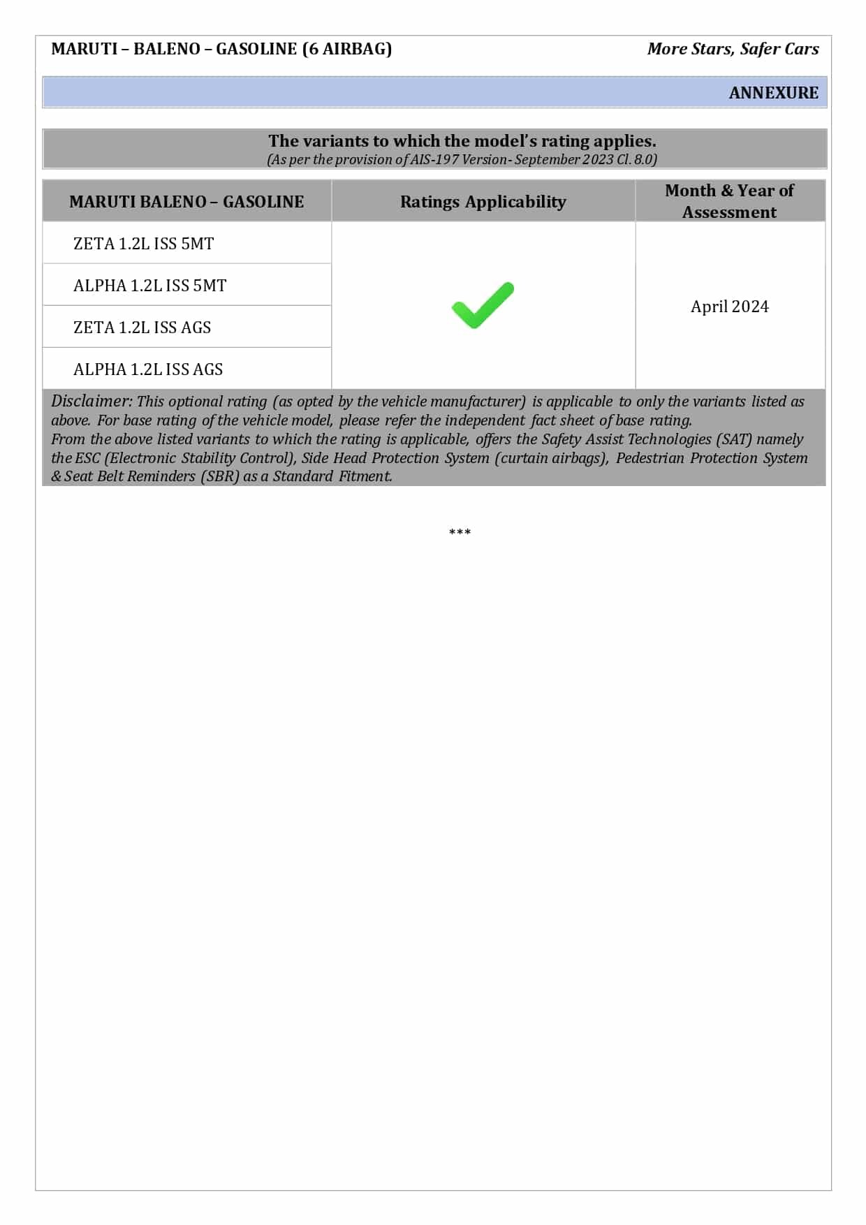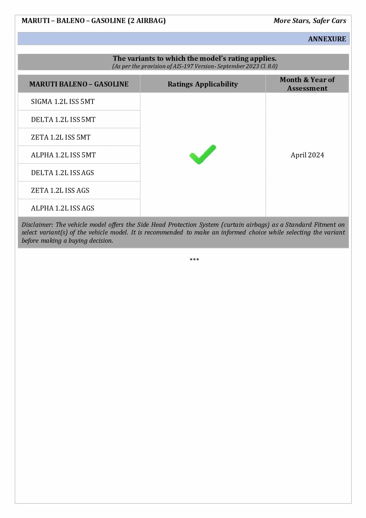 Zeta , Alpha போன்ற டாப் வேரியண்டுகளில் 6 ஏர்பேக்குகளை பெற்ற வேரியண்டுகளை சோதனை செய்த நிலையில், 32 புள்ளிகளில் 26.52 புள்ளிகளைப் பெற்று 5 நட்சத்திரக்கு 4 நட்சத்திரத்தை பெற்றுள்ளது. குழந்தைகளுக்கான பாதுகாப்பில் பெற வேண்டிய மதிப்பெண்கள் 49 புள்ளிகளில் 34.81 புள்ளிகளை பெற்று 3 ஸ்டார் ரேட்டிங்கை பெற்றுள்ளது.